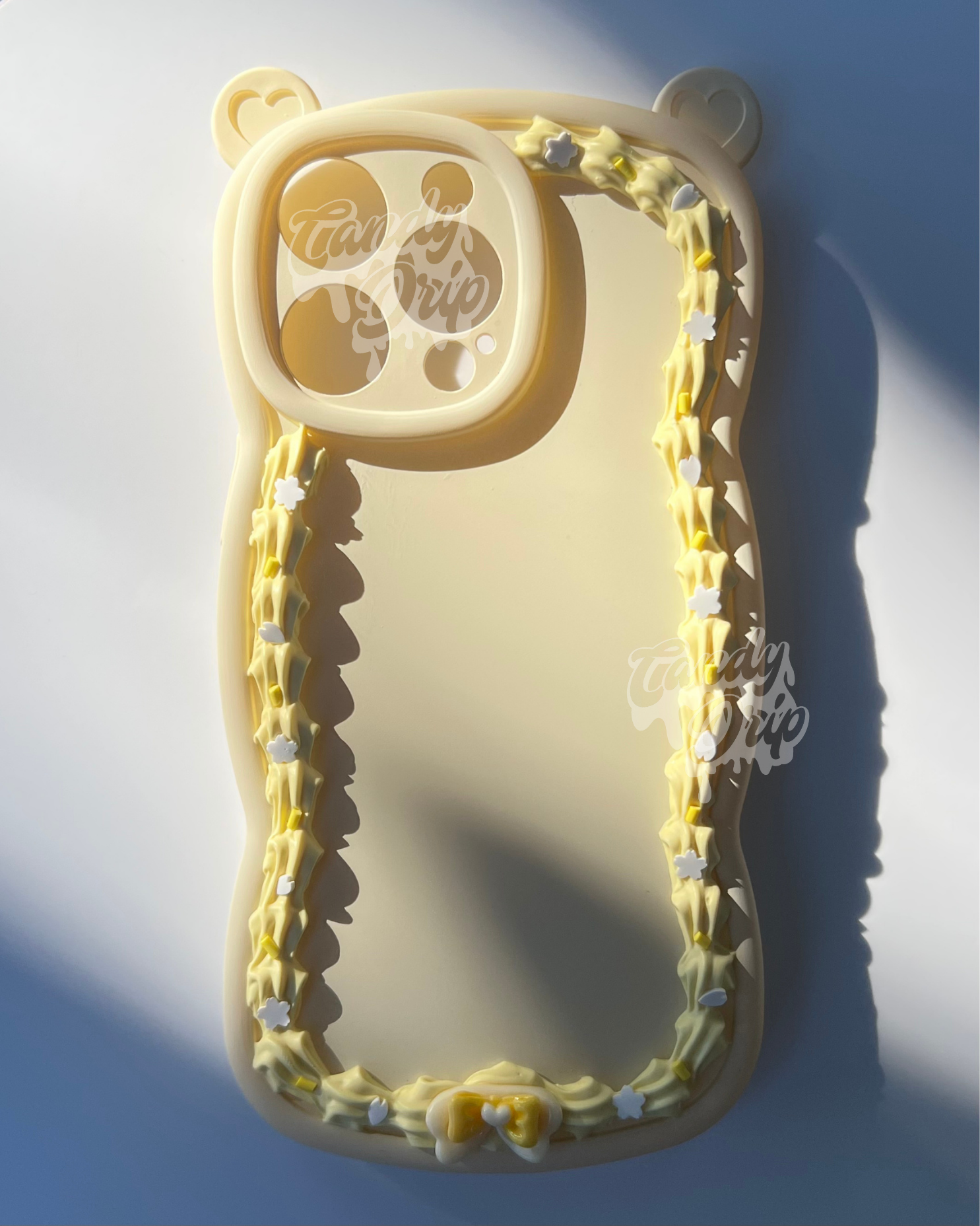 A sweet, oat-coloured bear phone case featuring pastel yellow decoden piping, topped with white blossom confetti, banana yellow sprinkles and a cute double layer bow charm! ππ₯£π