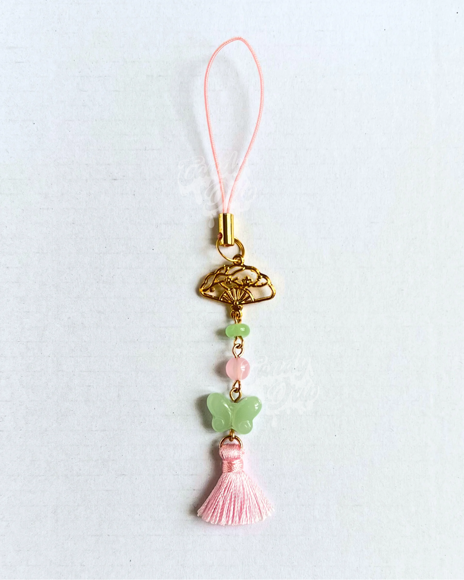 Add a touch of delicate beauty to your look with our Blossom Fan. 🪭 With a pastel green glass butterfly, a soft pink tassel and a golden fan adorned with a blooming blossom branch, this keychain is perfect for special occasions or everyday elegance. 🌸