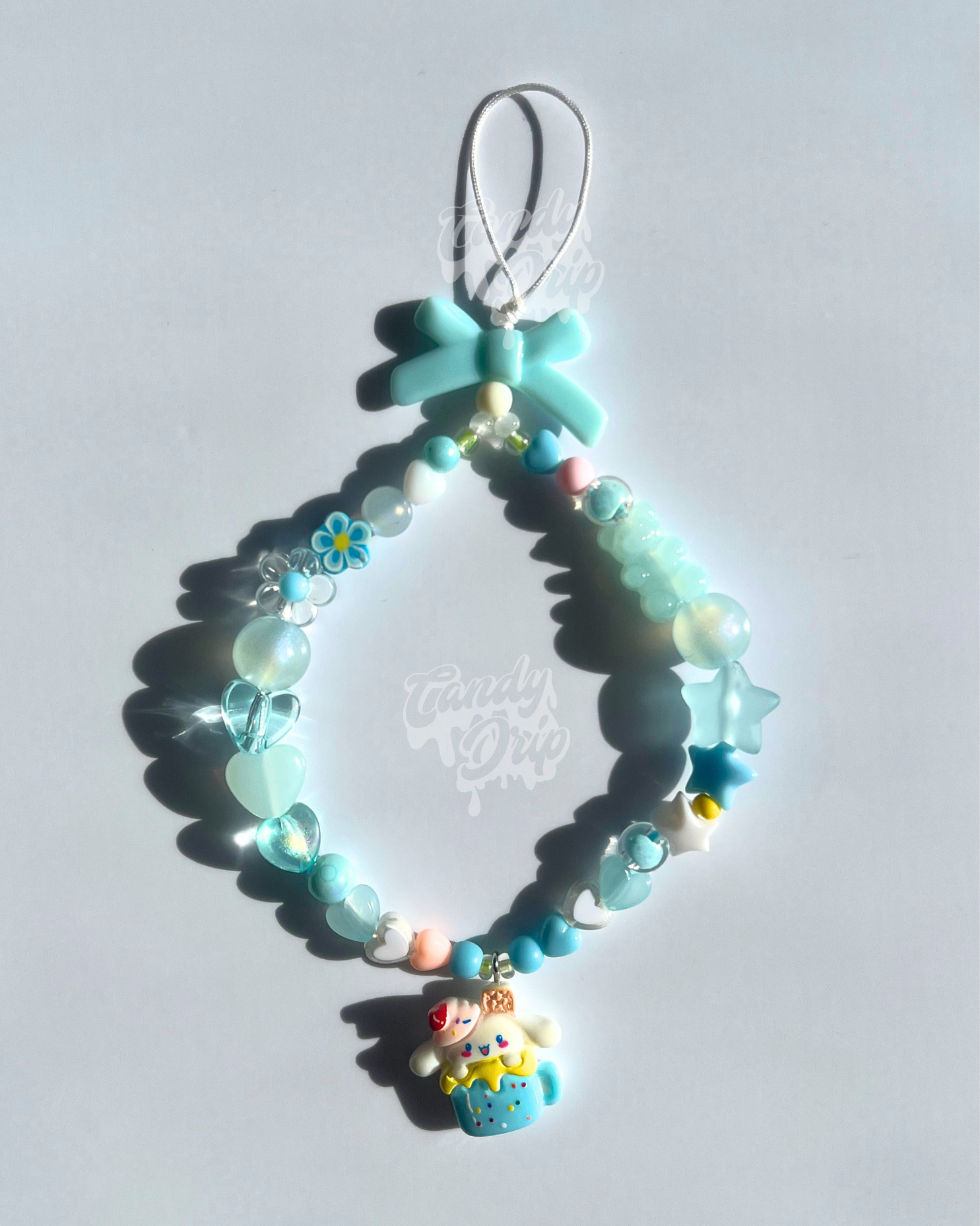 The lucky last wrist strap in our pastel bow series! π This blue medley style wrist strap has pops of pastel pink & cream coloured beads here and there to compliment the ice cream pup charm. π©΅π¦